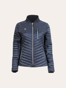 The jacket offers a snug, figure-hugging fit, complemented by an adjustable hem for personalized comfort. Sporting a chic, athletic design, the jacket features a low, ribbed collar that adds to its contemporary appeal. Highlighted by stylish silver-colored zippers, this piece exudes modern sophistication.
