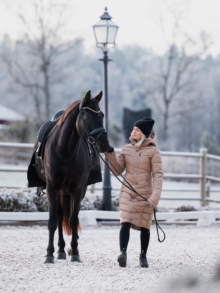 The Nordic riding coat features a practical two-way zipper at the front and a high vent at the back that can be easily opened. This design gives you full control over your freedom of movement. You can let the coat's sides hang down to keep your thighs warm while seated in the saddle or adjust the fit according to your activity. Leg straps on the inside of the coat ensure it stays in place, even in windy conditions.We understand how challenging it can be to keep warm while wearing thin riding gloves. That's why the cuffs of the Nordic riding coat include Uhip's unique hand warmers. These can be easily folded to warm your hands while carrying equipment or holding the reins, providing a stylish solution for cold winter days!