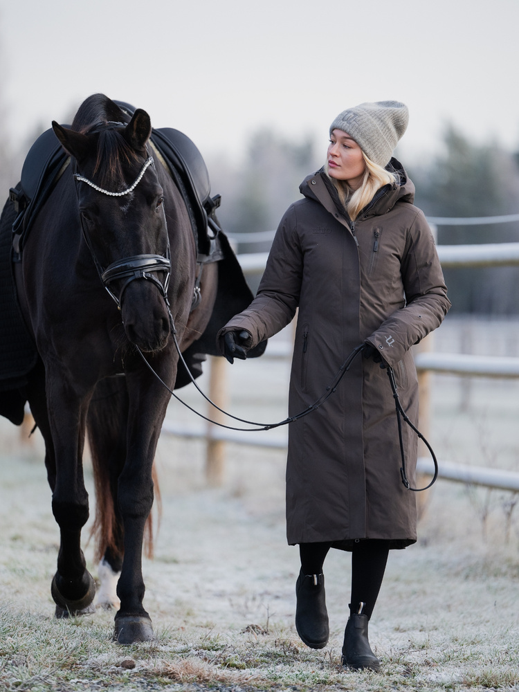 The coat is packed with Uhip’s smart features for riding, stable work, and all kinds of outdoor activities. The cuffs can be discreetly folded down to protect cold fingers, and the detachable hood can be adjusted both front and back. Add the optional hands-free strap, which attaches inside the coat, allowing you to take it off and let it hang on your back without getting in the way during walks or stable work. Elevate your winter wardrobe with Rime, where style, functionality, and sustainability come together perfectly.The coat fits true to size and has a regular fit. The length of the coat in size 38 is 111,5 cm. There is a 2 cm difference between each size.