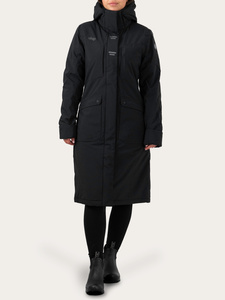 The insulation is a technical material with excellent warming properties due to its ability to reflect body heat. The outer fabric has some stretch and features a membrane that resists rain and wind. To ensure rain stays on the outside, the coat has taped seams. The high, comfortable collar with soft lining, together with the length of the coat, encloses the heat and ensures that your body heat keeps you warm without the air escaping.Smart features for equestrians