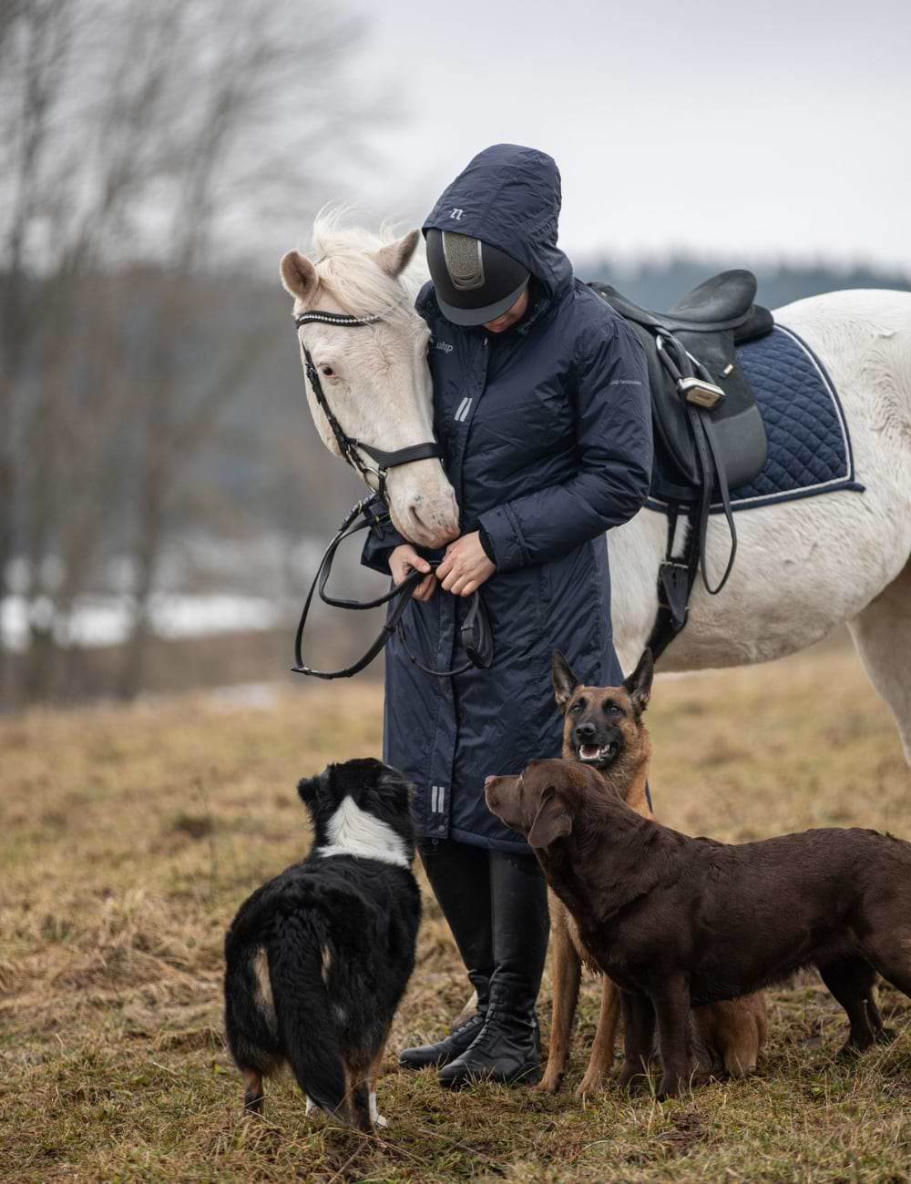 Men det är inte bara hundar som bor på gården – där finns även två charmiga shetlandsponnyer och knabstruppern Berra, som sätter ytterligare guldkant på livet utomhus.